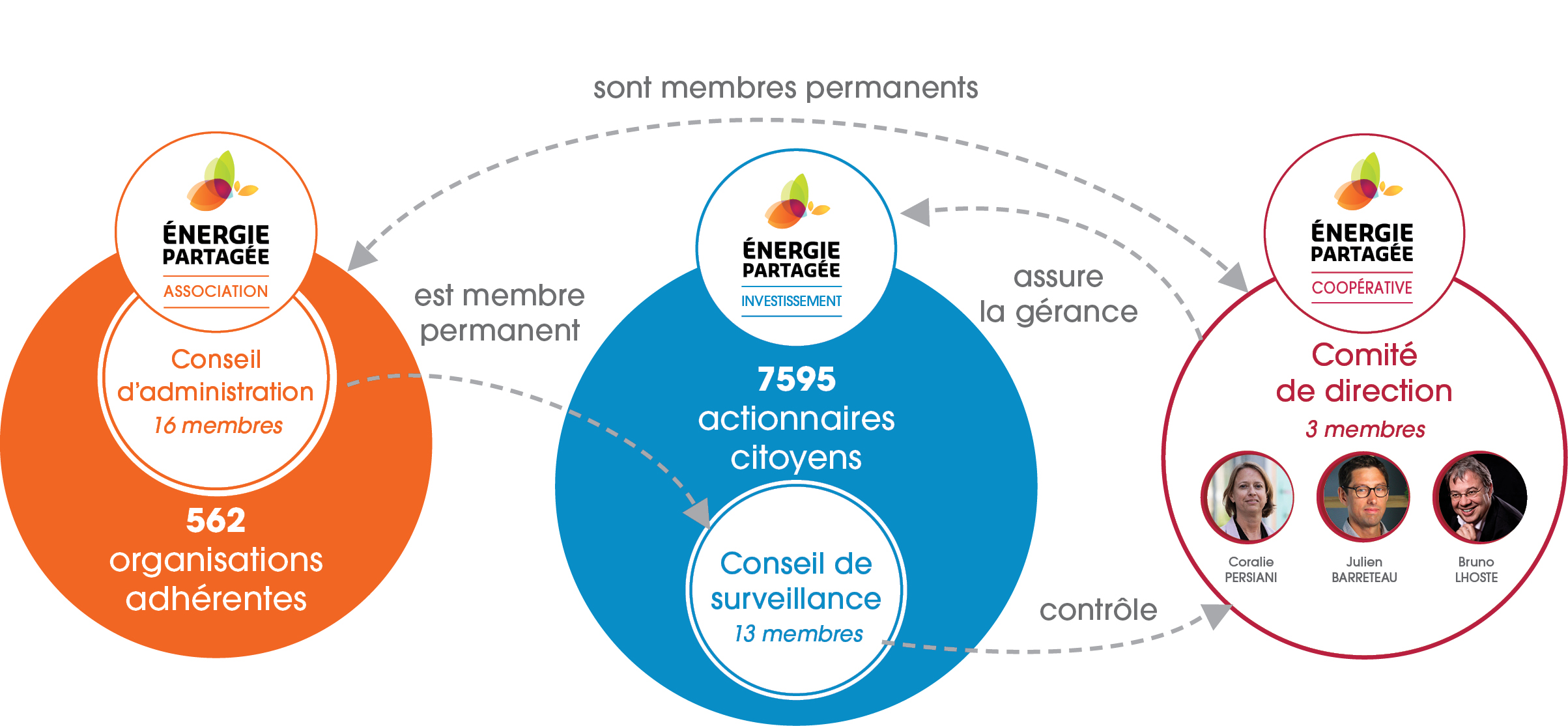 - Énergie Partagée Association agit au nom de ses adhérents par son Conseil d’administration. Celui-ci est membre de droit d’Énergie Partagée Coopérative, ainsi que du conseil de surveillance d’Énergie Partagée Investissement.