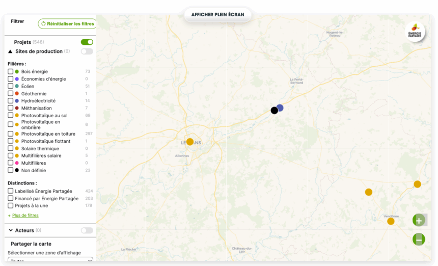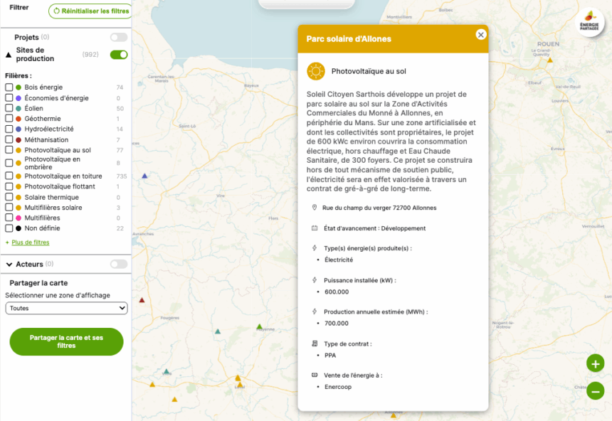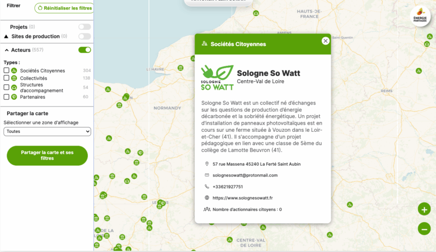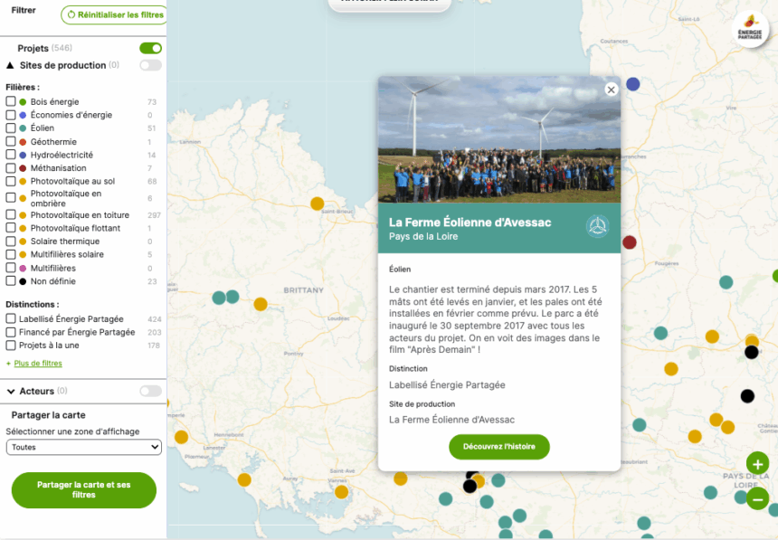 Les acteurs sont visibles en activant un des filtres de la cartographie de l’énergie citoyenne.