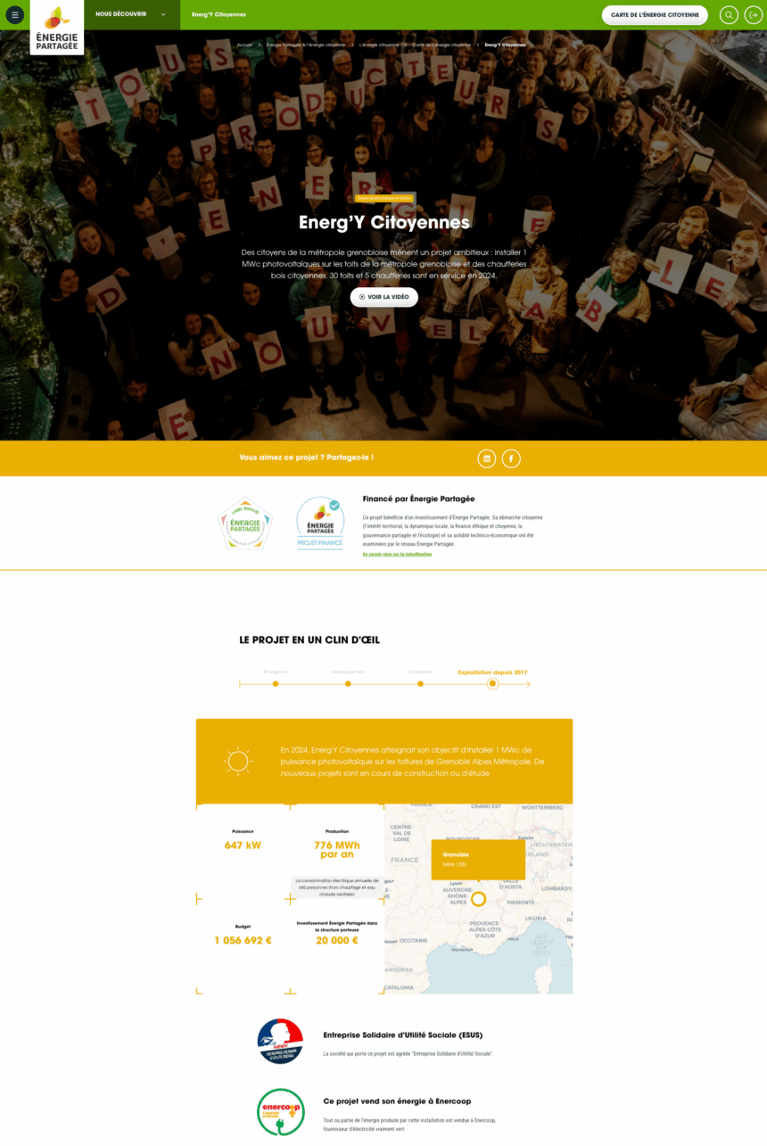 - Les données renseignées dans la partie « projet » sont essentiellement des éléments de communication qui permettent de « raconter une histoire » avec des photo, des témoignages,… Ces données vont permettre de créer automatiquement une « Fiche projet » sur le site internet d’Énergie Partagée :