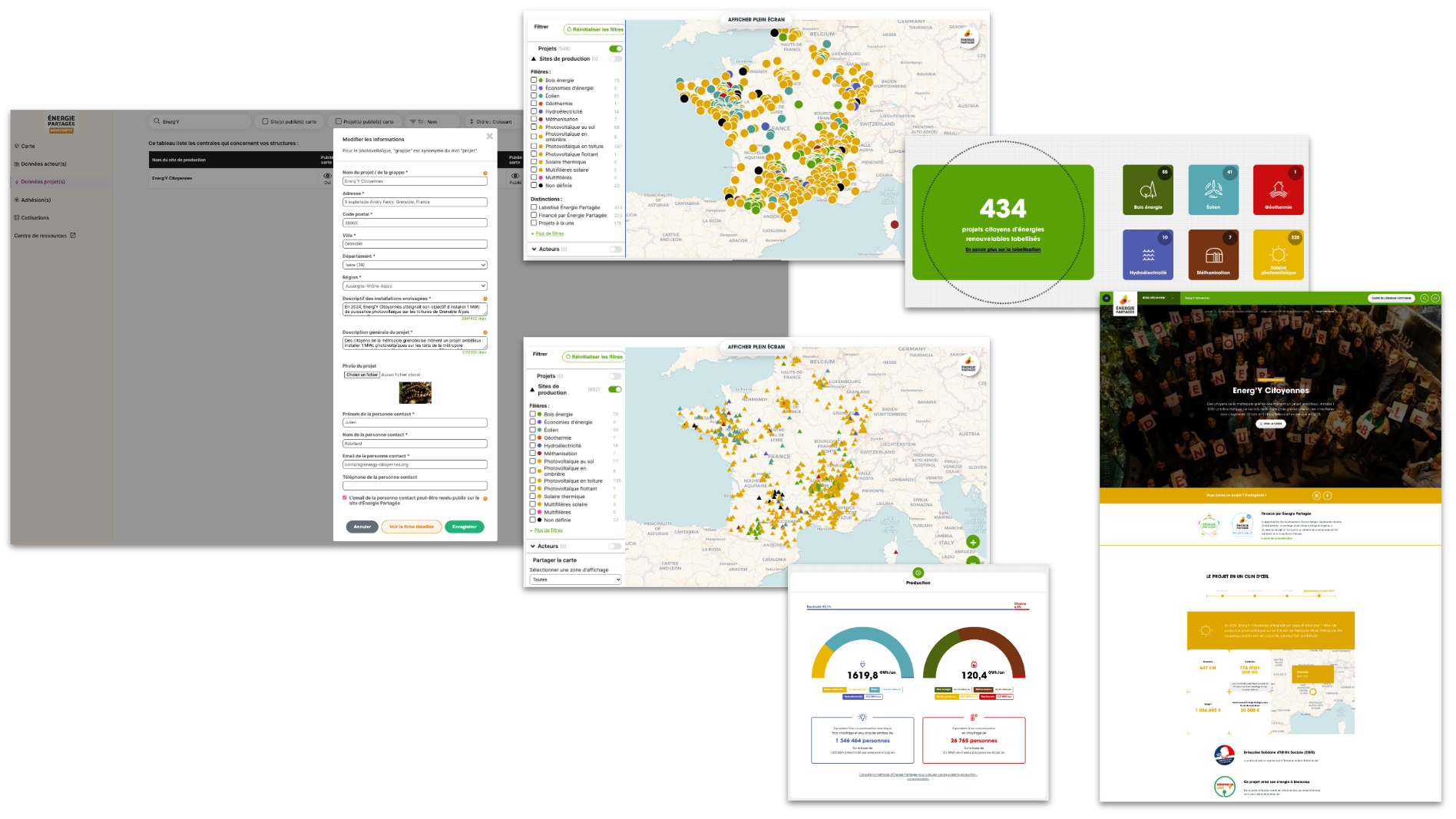 - Les données renseignées dans la partie « projet » sont essentiellement des éléments de communication qui permettent de « raconter une histoire » avec des photo, des témoignages,… Ces données vont permettre de créer automatiquement une « Fiche projet » sur le site internet d’Énergie Partagée :