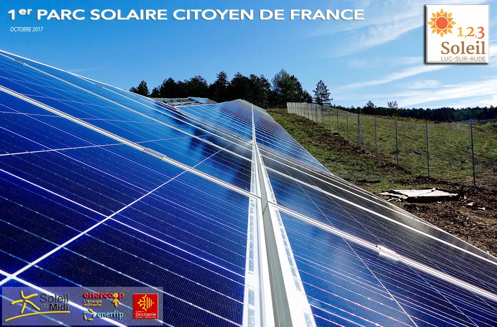 Initative de la commune de Luc-sur-Aude et du pionner des ENR citoyennes, SOLEIL DU MIDI, le projet 123-SOLEIL est le premier parc solaire 100% citoyen de France.