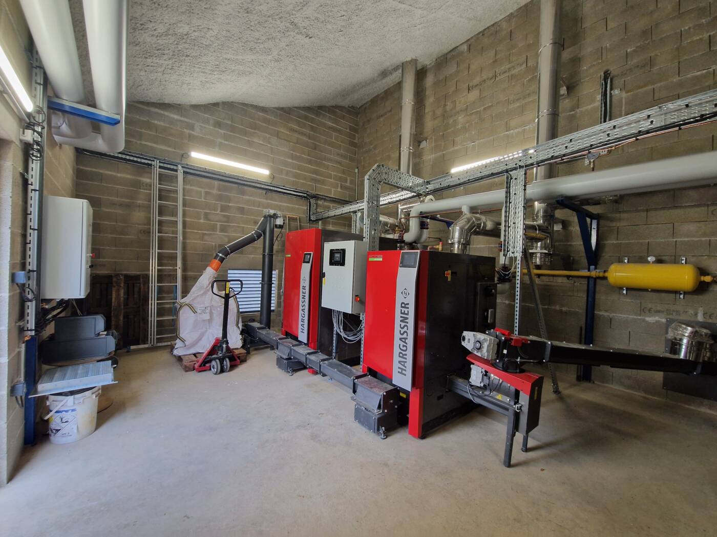ESTERA a construit un local permettant d'héberger 2 chaudières à bois (130+230 KWh) ainsi qu'une chaudière gaz de secours. Un ballon hydro-accumulateur de 20 m3 permet d'optimiser le fonctionnement du système. un réseau de chaleur enterré achemine la chaleur vers les différents bâtiments raccordés.