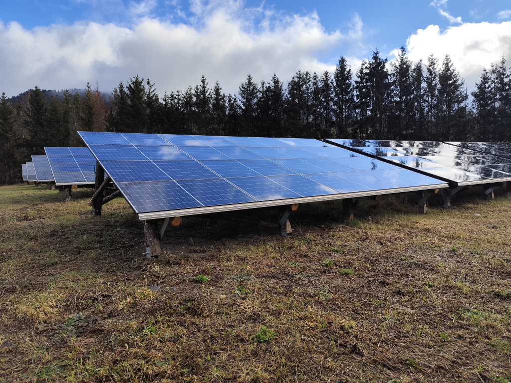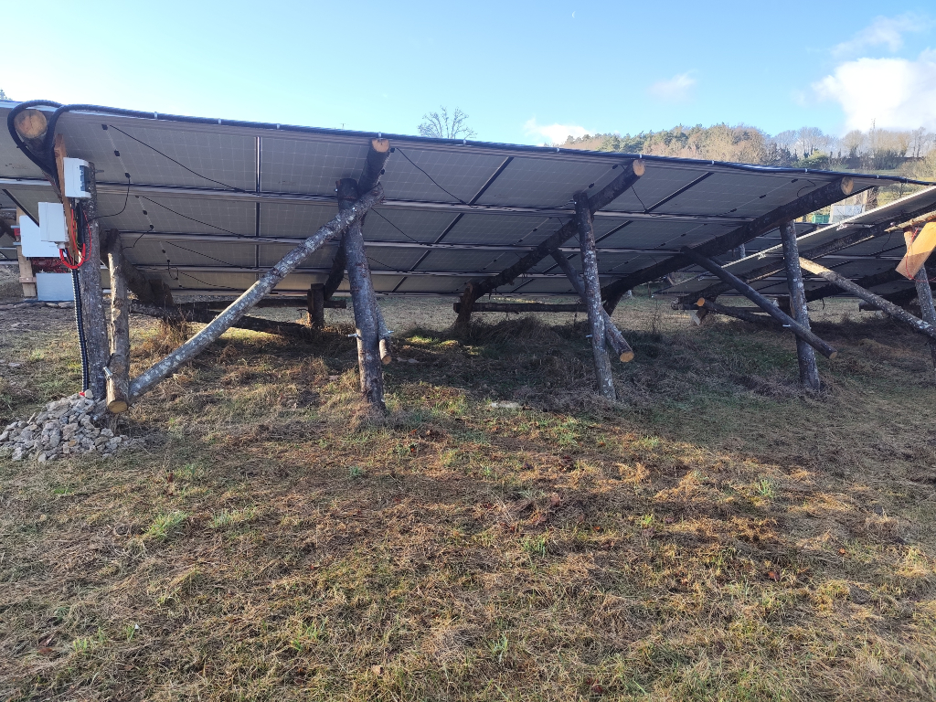 L’installation s’est faite en partenariat avec les acteurs locaux : forestiers, collectivités territoriales, entreprises locales… Les 736 panneaux photovoltaïques sont fixés sur des structures en bois brut issu des forêts locales gérées durablement, sans fondation béton ni terrassement, permettant de ne laisser aucune trace sur le terrain après le démontage en fin de vie de la centrale. Les sections de troncs bruts non sciés sont fournies par la société Mecowood, inventeur et concepteur de ce type de système.