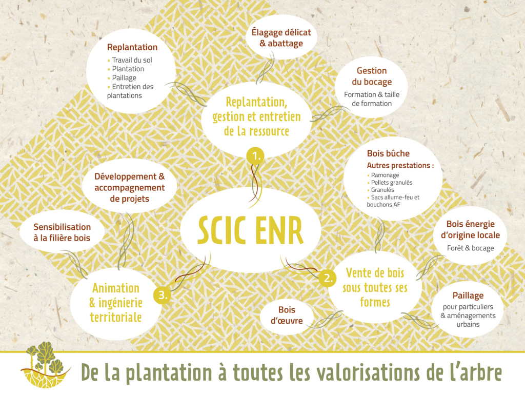 La vente de bois sous toutes ses formes est proposée par la SCIC EnR : bois de chauffage (bûches, pellets et allume-feu, bois déchiqueté), broyat pour le paillage (particuliers et aménagements urbains), bois d’œuvre. En plus d’un service de ramonage de conduits de cheminée par un salarié de la coopérative, celle-ci fournit également un travail d’élagage délicat et d’abattage d’arbres pour agriculteurs, particuliers et collectivités. « On est une des seules SCIC à s’être autant développée autour de l’arbre et des métiers liés. Il nous manque juste une pépinière ! », note Émily Duthion. Chaque année néanmoins, la coopérative propose une commande groupée de plants bocagers et forestiers auprès d’un sociétaire pépiniériste.