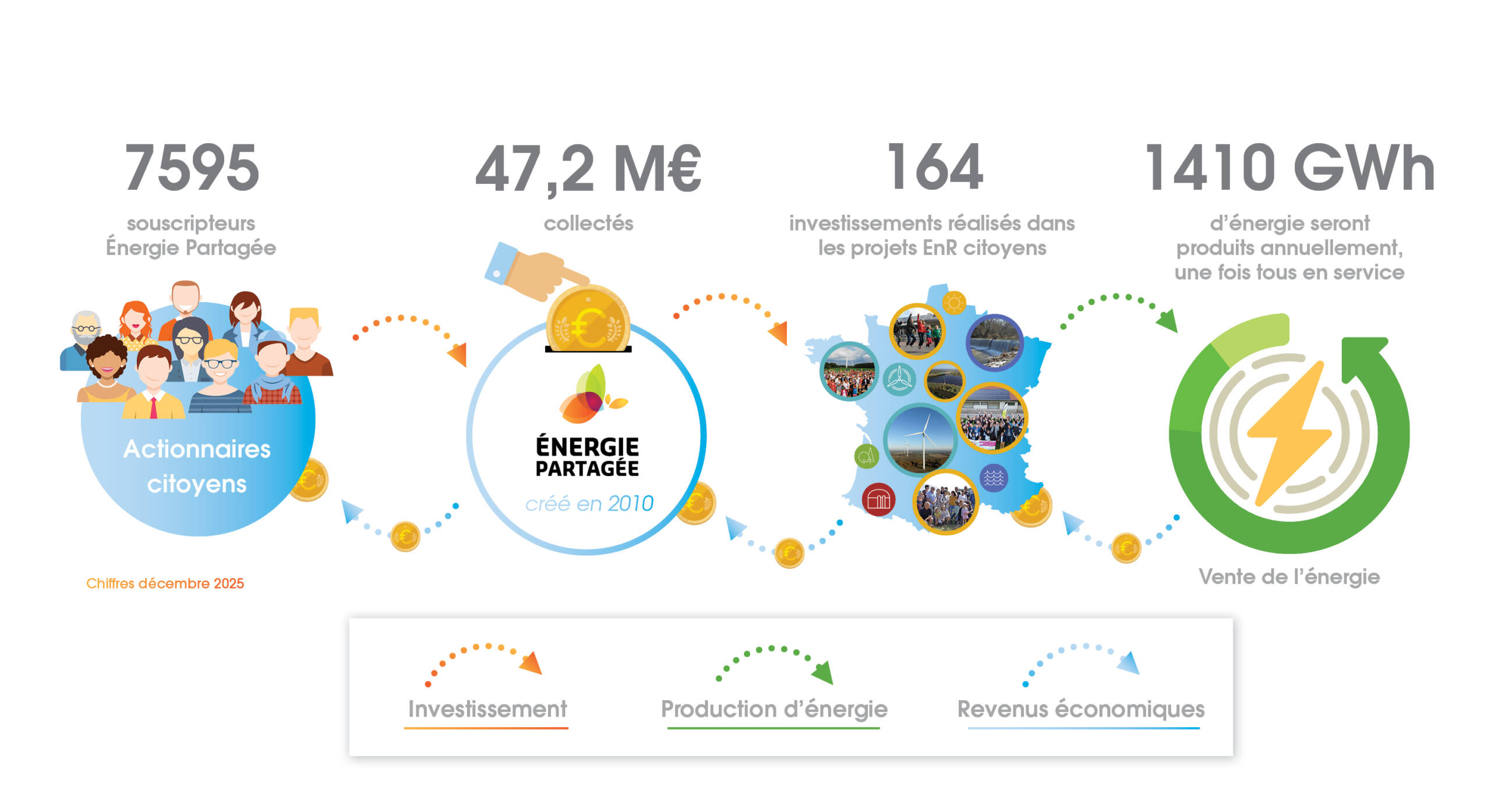 2. Parallèlement, Énergie Partagée collecte l’épargne citoyenne sur le territoire national et constitue ainsi des fonds mobilisables pour ses futurs investissements.